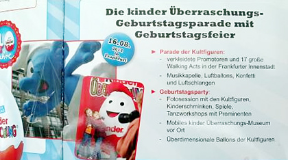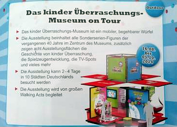 Am Samstag dem 16. 08. 2014 startet die Geburstagsparty vom Ü-Ei in der Frankfurter Innenstadt. Es gibt unter anderem eine Parade der Kultfiguren. Ein besonderes Highlight ist das Überraschungsei Museum on Tour. Das Ü-Ei Museum wird bis zum 5. 10. 2014 in insgesamt 10 deutschen Städten zu sehen sein. In welchen Städten genau können wir noch nicht sagen. Der begehbare Ü-Ei Museumswürfel zeigt eine Ausstellung der Sonderserie der vergangenen 40 Jahre. Quelle: [Dieser Eierlei Forums Beitrag]
