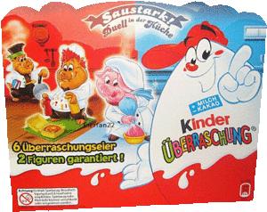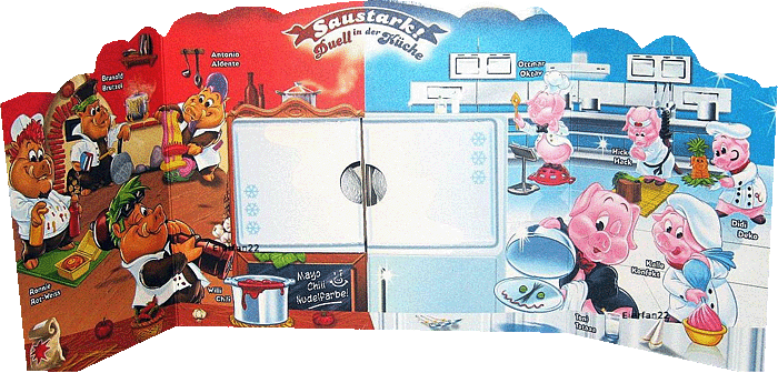 Nicht nur die ersten Ü-Eier vom "Duell in der Küche" sind zu bekommen, sondern auch schon das 6er Pack zur Serie. Saustark geht es weiter, wenn das 6er Pack geöffnet wird. Eine schöne Kulisse mit allen Figuren ist zu sehen. Links ist das Team "Schweinelecka" und rechts das Team "Pigfein". Zwei Figuren werden garantiert, aber dafür ist der Anschaffungspreis von ca. 3,75 Euro nicht ohne. Ab sofort können wir den ersten Posten Sätze von den saustarken Schweinen anbieten. [Zum Ü-Eier online Shop]. Danke für die Bilder an Eierfan22
