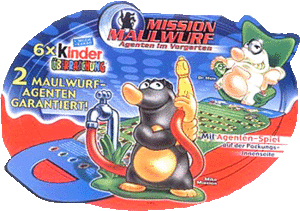 Der PAH von den 6er Sonderverpackungen soll darauf hinweisen, dass von den 6 Ü-Eiern 2 garantiert einen Maulwurf beinhalten. Die zweite wesentliche Information ist die, dass in der Sonderverpackung sich noch ein Agenten-Spiel auf der Packungsinnenseite befindet. [Alle Agenten gibt es im Shop]