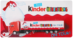Ferrero hat von dem Ü-Ei Truck eine Neuauflage herausgebacht. Der neue Truck unterscheidet sich gegenüber dem alten im wesentlichen durch anderes Design. Er hat einen Aufkleber auch auf dem Dach, die Zugmaschine ist von Mercedes Benz und nicht von MAN und das der Blister von hinten nicht einsichtbar ist (Blister ist der Fachausdruck für das Plastik und die Pappe um den Truck). Das zweite Bild zeigt die Rückseite des Blisters. [Link zu dieser neuen Truck Auktion] Ein paar Exemplare vom alten Truck sind noch im Eierlei Shop zu bekommen. [Link zum Shop]