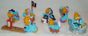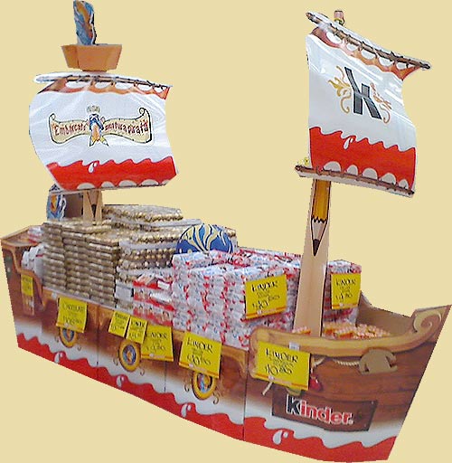 In Mexiko gibt es jetzt die "Embarcate Loropiratas". Der Satz ist erstmalig 2000 als "Pappagalos" erschienen. Das Bild zeigt ein 3er Pack der Loropiratas. Es gibt sie noch in einem 1er Pack und im Display. Die mexikanische Serie besteht aus 7 Figuren mit den Kennungen TT001 bis TT003 und TT006 bis TT009 und 7 verschiedenen BPZ Rückseiten. Diese Nummern entsprechen der Nummerierung des SU-Kataloges. Die Bemalung entspricht der "roten" Variante des Katalogs. Im Vergleich zu den Figuren von 2000 steht anstelle von "Ferrero" die Kennung. Das Brett der Figur TT007 hat nur 2 Teile. Ein wahrer Hingucker ist dieses Piratenschiff der Embarcate Loropiratas. Das Piratenschiff hat die unglaubliche Länge von 3 Metern. Es besteht aus 5 Bauteilen. Enthalten sind eine Menge Ferrero Produkte. Danke für die News an Lothar S. (MEX_EI) In Polen gibt es die Funny Stundents in diesen beiden 4er Packs. Wahrscheinlich werden 2 Figuren pro 4er Pack garantiert, der Hinweis ist die 2 in dem blauen Schild unten rechts auf der Verpackung. Des Weiteren gibt es die Funny Stundents jetzt in Ungarn und Slowenien. In Slowenien ist sogar eine Spielzeug Serie herausgebracht worden, die aber nur aus 3 Spielzeugen besteht.