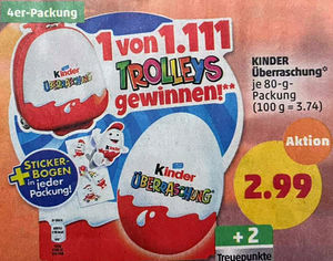 Zu gewinnen gibt es 1111 Ü-Ei Trolleys. Preis pro Packung liegt im Schnitt um die 3 Euro.