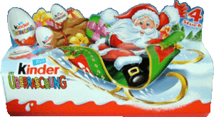 In Deutschland gibt es jetzt auch dieses rasante 4er Pack. Bis jetzt war das 4er Pack nur in Polen bekannt. Anscheinend handelt es sich hierbei leider nur um Testware. Die Verpackung gibt nicht preis, welche Figuren oder Serie den Käufer in den Ü-Eiern erwartet. Dieser Weihnachtsmann scheint seinen Schlitten gegen ein Auto getauscht zu haben. Es handelt sich hierbei um den aktuelle Kinder Mix ;-)