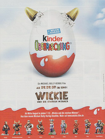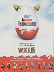 Diese Werbung von Wickie ist in der Zeitschrift "TV Movie" zu finden. Die Werbung ist auf einer DINA 4 Seite gedruckt. Aus dem Ü-Ei stoßen die beiden Hörner des Wikinger Helmes durch. In der Mitte wird auf den Filmstart hingewiesen. Unten im roten Bereich sind alle 9/10 Figuren der Serie zu sehen und mit Namen versehen. Die Wikinger im Eierlei [Shop]! Danke für die News an Norbert