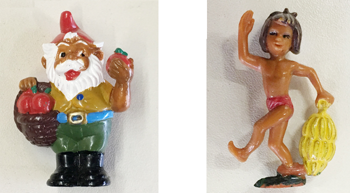 Hier möchten wir Euch zwei Figuren aus dem kuriositäten Kabinett vorstellen. Links geht es los mit Ferdi Fallobst mit roten Äpfeln und dunkelbraunen Grundmaterial. . . halt stopp. . . das sieht komisch aus auf dem zweiten Blick. Tatsache ist, dass die Haut einfach dunkel bemalt wurde. Was den Anschein erwecken soll, dass es sich um die Top Ü-Ei Variante von Ferdi Fallobst aus dunklem Grundmaterial handelt. Weiter geht es mit Mogli. Auffällig ist der kleine dunkle Tritt. Von der Vorderansicht sieht Moglis Fuß etwas verklumpt aus. Unter dem Tritt steht sogar Walt Disney. Bei diesem Mogli handelt es sich um eine Restauration, wo der Fuß abgebrochen war und weg ist. Hier wurde einfach vom Diener (aus der Dschungelbuch Serie) der Fuß angeklebt. Die Materialfarbe ist fast identisch und unter dem Fuß steht "Walt Disney Produktion". Dieser Bericht sollte nicht nur skurril sein, sondern darauf hinweisen, dass immer wieder Fälschungen bzw. manipulierte Sammlerstücke auf dem Ü-Ei Markt vorhanden sind. Noch mehr Informationen dazu in unserer extra "Fälschungs Rubrik".