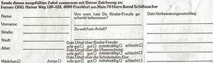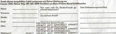 Uns wurden diese zwei BPZ von einem Kinder-Freude (Maxi Ei) Gewinnspiel von 1979 zugesendet. Da die Berichte über alte, schon vergessene, oder nicht bekannte Ü-Ei Sachen sehr gut bei unseren Lesern ankamen, möchten wir weiterhin darüber berichten. Die vier Bilder zeigen zwei BPZ von beiden Seiten. Der lange BPZ links und rechts hat eine Gesamtlänge von 27,5 cm. Auf dem langen BPZ stehen 12 Basteltipps, was alles aus den leeren Maxi Ei Kapseln gebaut werden kann. Insgesamt sind 12 Vorschläge, teilweise mit Bildern, auf den BPZ. Der Favorit ist Nummer 12 der Flugkörper. Auf der Rückseite des BPZ (rechts zu sehen) gibt es Vorschläge zum Ausschneiden, um den Flugkörper zu basteln. Der zweite BPZ ist ein deutliches Stück kleiner. Mit dem zweiten BPZ konnte an einem Gewinnspiel bei Ferrero teilgenommen werden. Dies ist der ganze Text von der Vorderseite des BPZ: "Wenn Du eine neue Idee für die Weiterverwendung des Kunststoff-Eies zeichnest, und sie mit diesem ausgefüllten Zettel an uns sendest, bekommst Du von uns ein schöne Überraschung und nimmst damit außerdem an einem Wettbewerb teil. Eine Jury wird am 15. Januar 80 die besten 6 Vorschläge auswählen. Der Preis für die besten Ideen ist je ein Fahrrad mit allen Drum und Dran, oder der entsprechende Wert in Höhe von 200 Mark. " Die Rückseite des BPZ ist der Teilnahmeschein, wo neben der Anschrift noch eine Bewertung über "Kinder-Freude" abgegeben werden konnte. Vielleicht weiß ja noch jemand, was die schöne Überraschung früher war die man bekommen hat, wenn man an dem Gewinnspiel teilgenommen hatte. Wir hoffen, dass Euch der Bericht gefallen hat und möchten uns bei Hans-Dieter G. für die Bilder bedanken.
