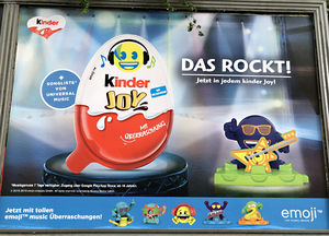 Der Slogan lautet "DAS ROCKT! Jetzt in jedem kinder Joy!". Unten in der Fußzeile sind 5 Figuren zu sehen, wobei noch auf die emoji music hingewiesen wird.