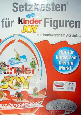 Auf dem Bild ist links ein Kinder Joy Setzkasten zu sehen. Den Setzkasten gibt es in den Real Märkten mit Piazza Ferrero. Der Preis pro Setzkasten ist 24,90 Euro, immer ohne Figuren. Am Setzkasten sind Acrylglasplättchen, wo die ICE AGE 3 Figuren stehen können. [Alle ICE AGE 3 Figuren im Eierlei Shop]