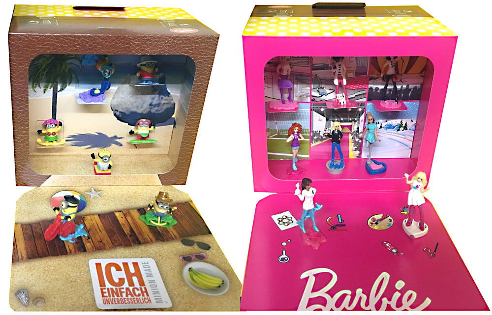 Das Diorama wird an der Vorderseite von oben nach unten geöffnet. Auf dem großen Bild rechts sind die Figuren der Serie zu sehen. Das Hintergrundbild bei den Minions ist ein Sandstrand mit Palme und Fels, wo jede Figur in Szene gesetzt ist. Bei den Barbies hat jede Figur ihr Motto als Hintergrundbild.