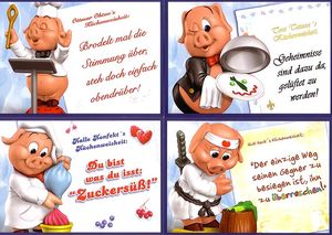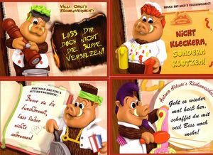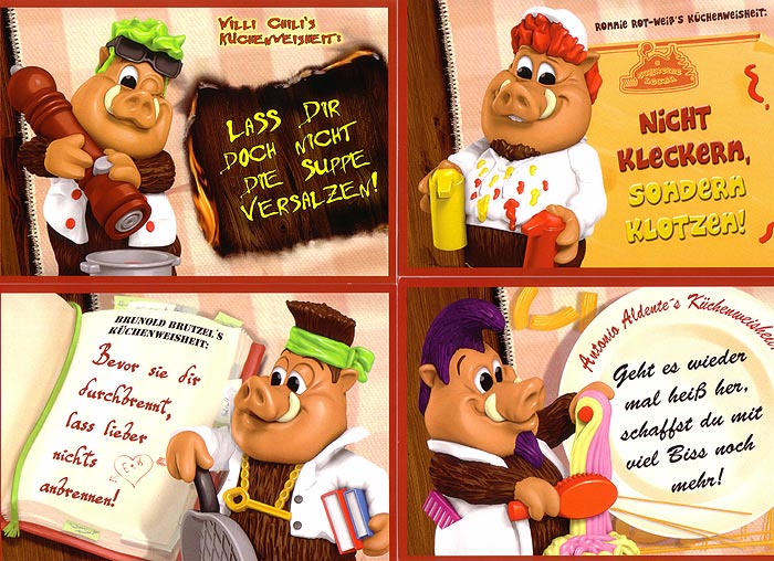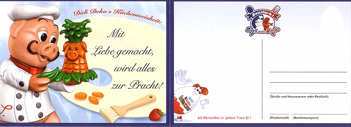 Exklusiv möchten wir Euch die 9 Postkarten von der kommenden Ü-Ei Serie vorstellen. Die Karten sind witzig und gleichzeitig liebevoll gestaltet. Zu jeder Figur gibt es eine Karte mit dem passenden Slogan dazu. Schade nur, dass die Karten wieder sehr selten sein werden und für die meisten Sammler nicht zu bekommen sind. Die erste Karte ist von Didi Deko, rechts daneben ist die Rückseite dazu. Weiter geht es mit den 4 Figuren vom roten Küchenteam. Bitte lest Euch die Sprüche in Ruhe durch. Hier die weiteren Karten vom blauen Team. Auslieferungsstart der Serie ist der 1. 11. 10.