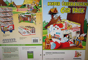 Wir dürfen uns über die Asterix-Jubiläumsserie in Deutschland freuen. Serienstart ist Dezember 2009. Der Satz besteht aus 8 Figuren, die alle ein Geschenk in der Hand halten. Im Baum rechts auf dem Bild steht eingeritzt "12 TV-SPOTS PRO TAG". Darunter wird erläutert, dass die Figuren auf Grund des 50 jährigen Bestehens erscheinen. Zur Serie wird es dieses 6er Pack geben. Das 6er Pack in Hausform kann aufgeklappt werden, wodurch eine schöne Kulisse einzusehen ist. Pro 6er Pack werden 2 Asterix Figuren garantiert. Auslieferung ist der 28. 12. 09. Quelle: Diese eBay Auktion