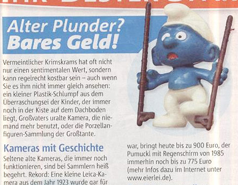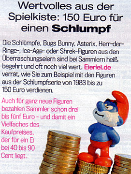 Mit dieser Überschrift wurden viele Leser der TV14 Zeitschrift auf Eierlei geleitet (März 2011). Die zweite Überschrift bezog sich auf Ü-Ei Figuren "Wertvolles aus der Spielkiste: 150 Euro für einen Schlumpf".