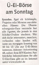 Im Mai 2009 hat das Berliner Abendblatt auf Wochenendveranstaltungen aufmerksam gemacht. Der Zeitungsausschnitt kündigt die Ü-Ei Börse in Berlin Spandau an.